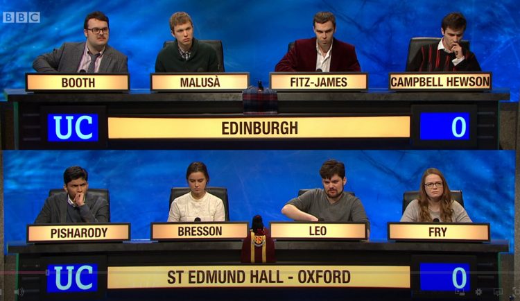 Last night, the final of the 2018-19 series of University Challenge was broadcast on BBC2 and, after a very exciting and close match, Edinburgh University were crowned as champions after beating the St Edmund Hall team by 155 to 140 points. It really was a nail-biting conclusion to this year’s competition, which saw the lead switch several times. Congratulations to Edinburgh on their victory, and to all the players on both sides for making it such an entertaining final.